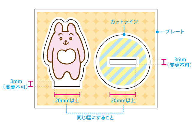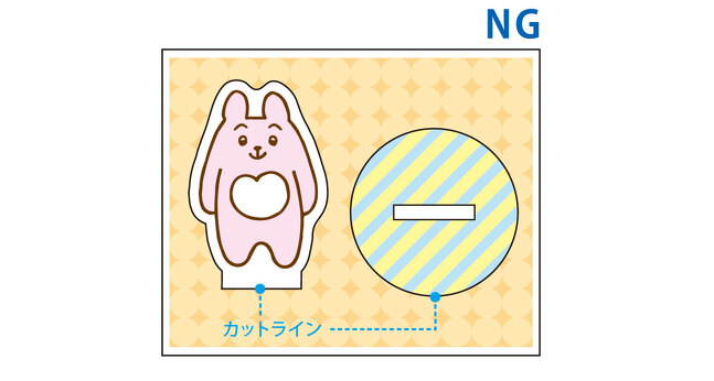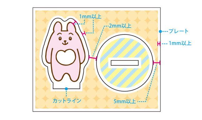 デザインはカットラインから1mm以上離してください。イラストがカットラインギリギリまであると、アクリル板のカット時に印刷部分の不良につながる恐れがあります。