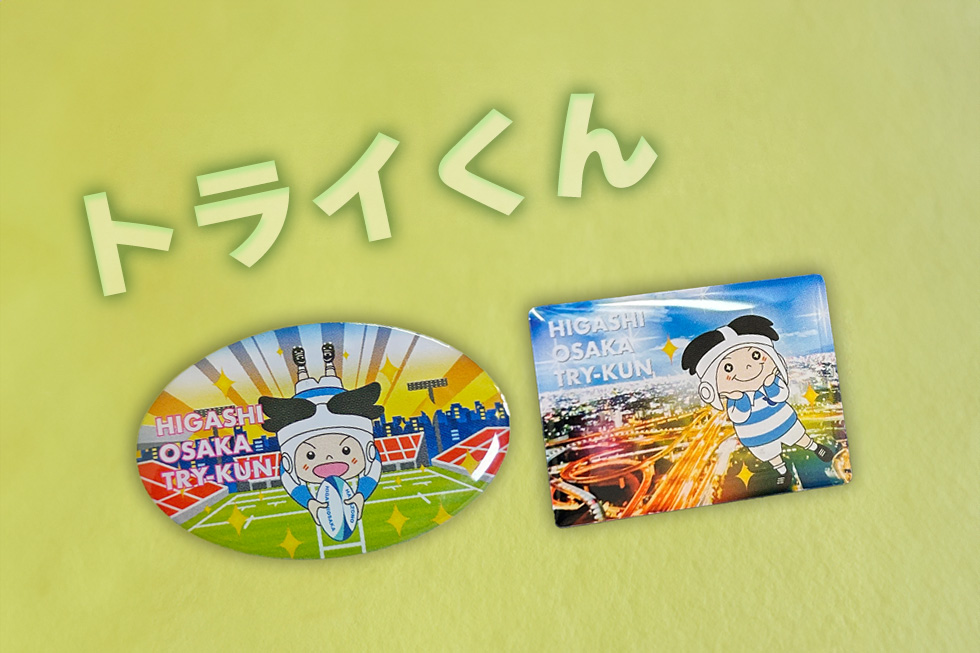 東大阪市の公式キャラクター「トライくん」のピンバッジ(2種)を制作しました!