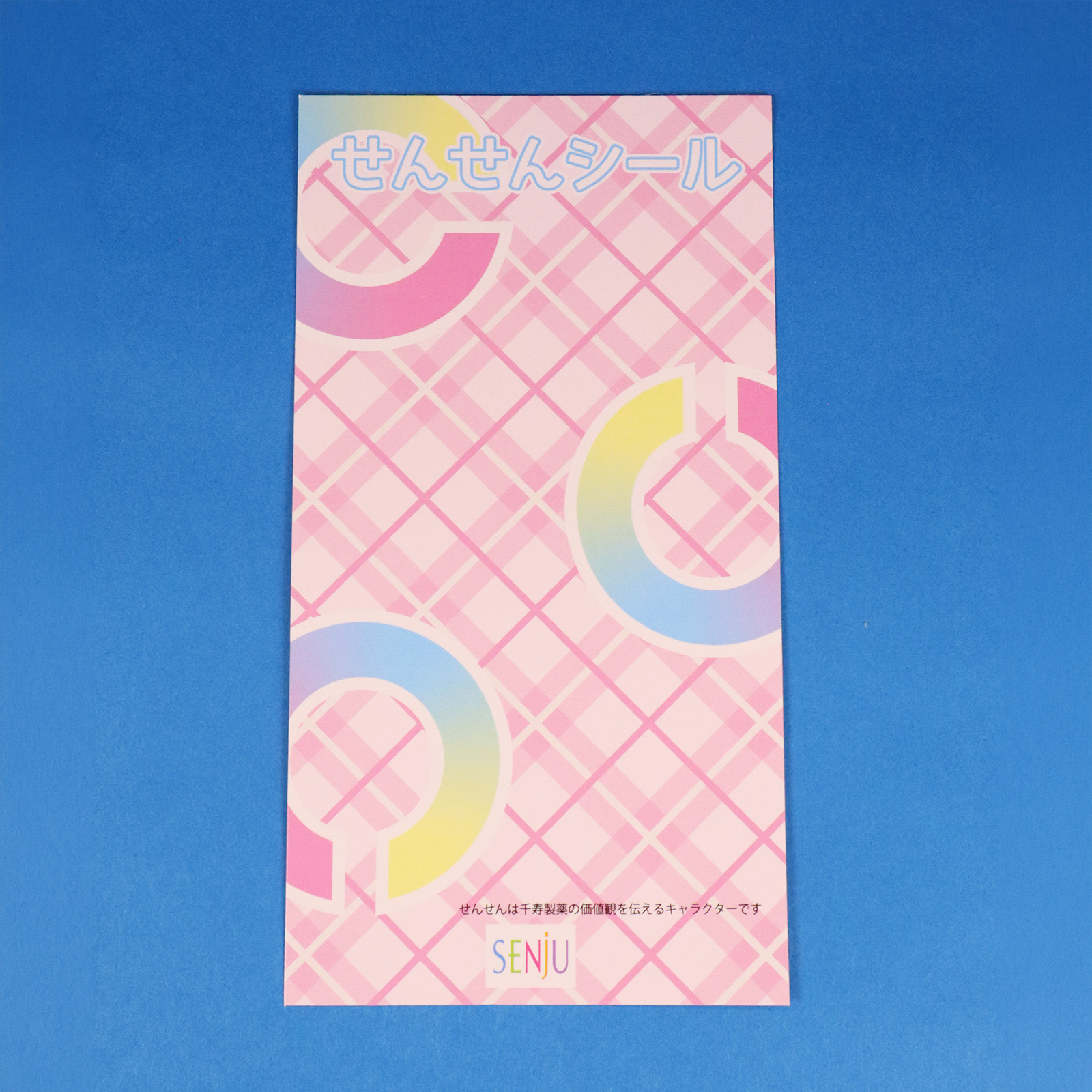 表には「せんせんシール」のタイトルと千寿製薬様のSENJUロゴ、そして「せんせんは千寿製薬の価値観を伝えるキャラクターです」というメッセージも添えられており、受け取った方が千寿製薬様のことを自然と知るきっかけにもなっています📝✨