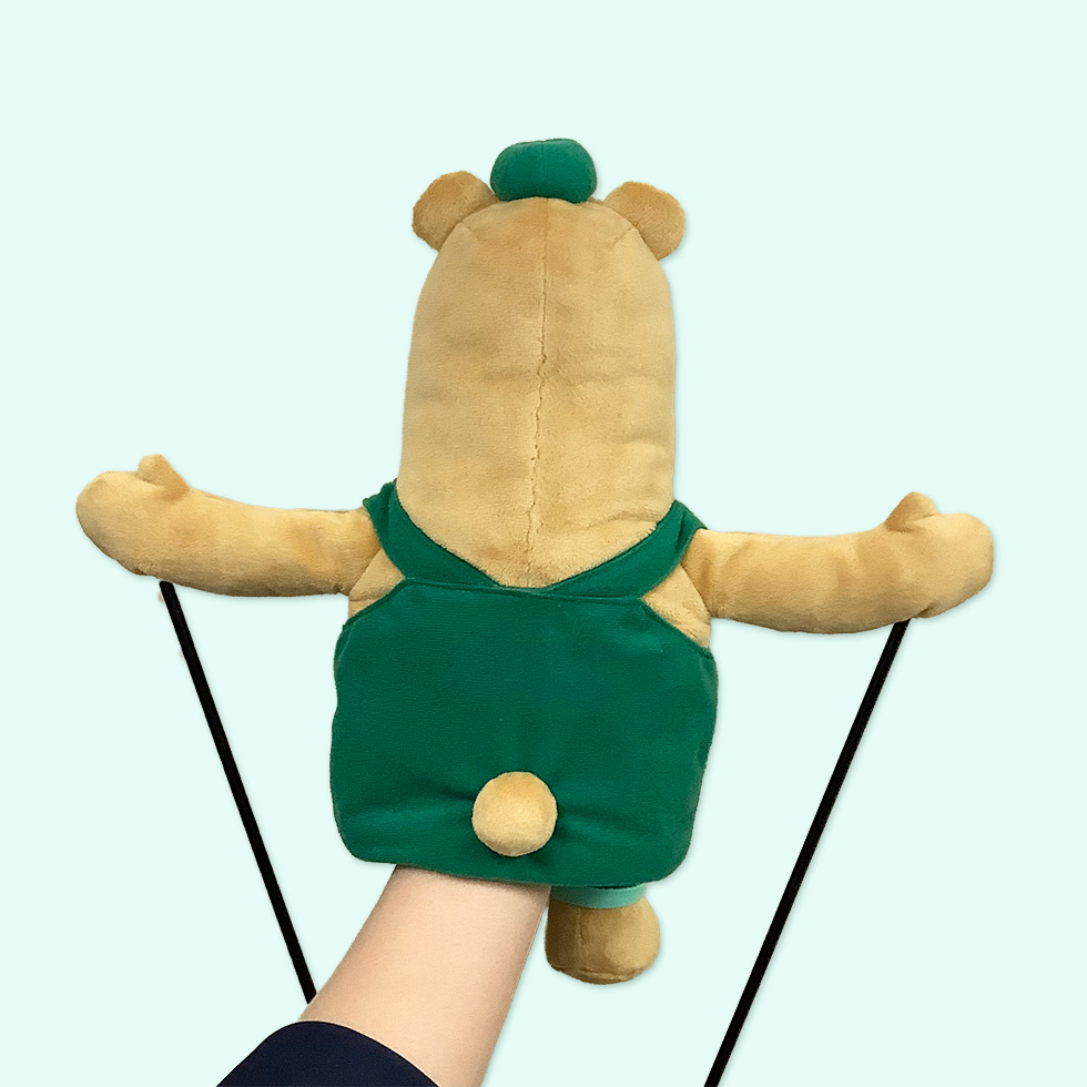 ベアロンは、片手は中に入れて、もう片方の手は棒を持って動かす棒付きパペットです💡