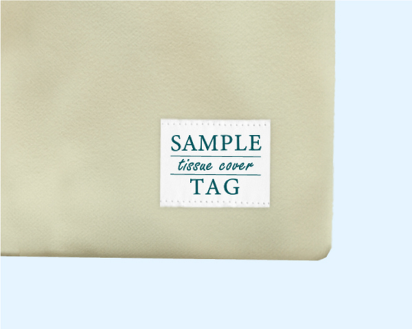 オプションとして、ティッシュカバーに布タグを付けることが可能です。タグのデザインやサイズなど、ご希望に合わせてお作りいたします。詳細は弊社営業担当にお問合わせください。